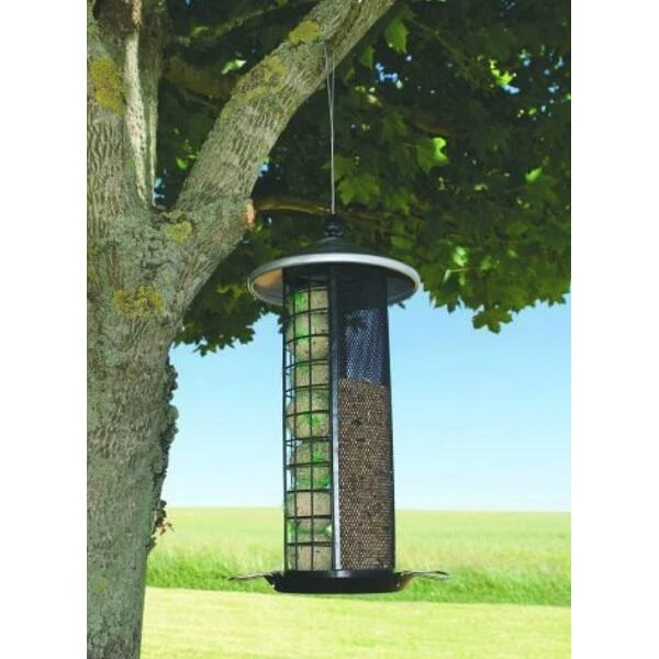 Een grote voedersilo waarbij je tegelijkertijd mezenbollen en noten of zaden kan aanbieden.