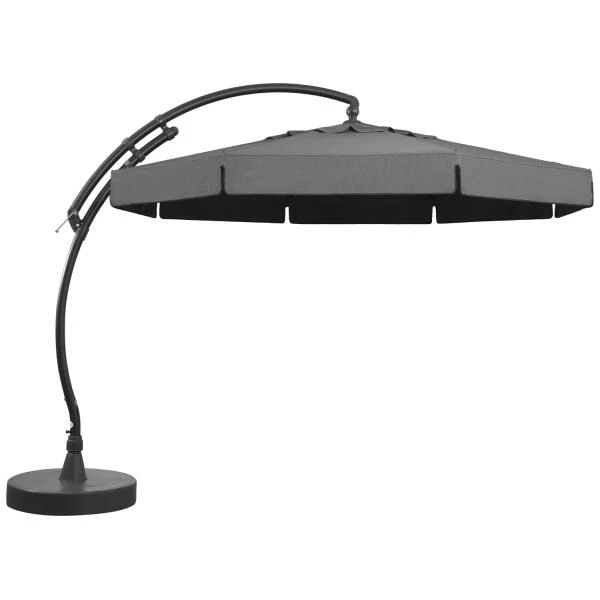 Het taupe olefin doek heeft een ventilatieopening om windopvang te beperken. Een uniek remsysteem voorkomt schokken op het doek of de mast wanneer de parasol open staat. De zomen hebben dubbele naden en elke spaak heeft een veerbelaste zuiger om jouw parasol extra te beschermen. De antracietkleurige voet van hars kan gevuld worden met water, zand, grind of klinkers tot 150 kg.