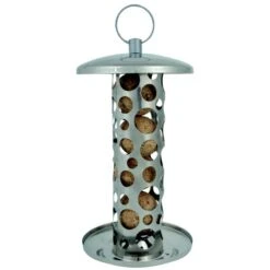 Mooie, moderne vetbollenautomaat in roestvast staal. Deze voederautomaat biedt plaats aan 4 tot 5 vetbollen en is geschikt voor het gebruik van vetbollen zonder netje. Een vetbollenautomaat heeft als voordeel dat grote vogels zoals kauwen en eksters er niet met volledige mezenbollen vandoor gaan.
