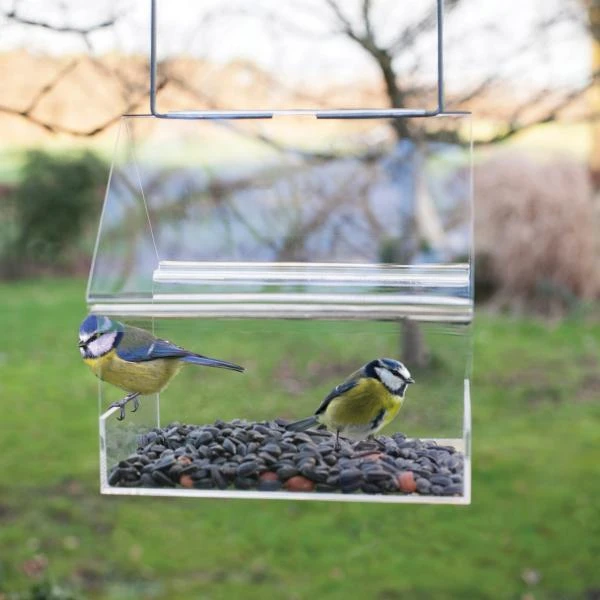 Dit transparante voederhuisje hang je op eender welke plaats in de tuin om jouw tuinvogels te voederen. Het huisje in plexi zorgt ervoor dat je de vogels steeds goed kunt observeren. Vogels kunnen bovendien potentieel gevaar van alle kanten zien aankomen en tijdig wegduiken indien nodig.