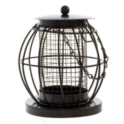 Een elegante voedersilo in de vorm van een vogelkooi die geschikt is voor het voederen van pinda’s aan tuinvogels. De silo is gemaakt uit metaal en afgewerkt met een donkerbruine coating. Aan de binnenzijde is een koker voorzien van gaas die met noten kan gevuld worden via het deksel.