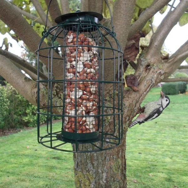Deze voedersilo is omgeven door een stevig gaasraster waardoor hij enkel toegankelijk is voor de kleinere tuinvogels zoals meesjes, mussen, roodborstjes,… Het voorkomt dat grotere vogels zoals eksters, kraaien, duiven,… of eekhoorns de kleinere vogelsoorten verjagen of al hun voeder opeten.