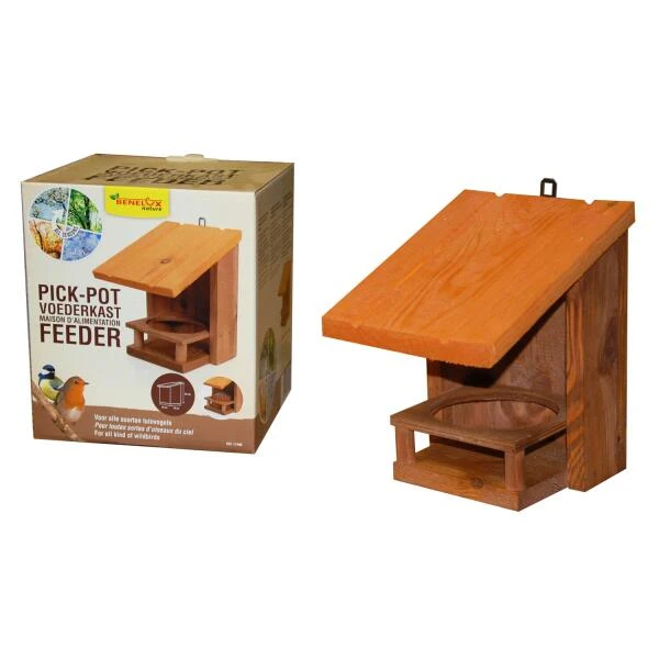 Een voederhuis dat door alle soorten tuinvogels kan worden gebruikt: mezen, winterkoning, putter, roodborst, mus, groenling, vink, lijster, boomklever, merel,…. Het houten voederhuis heeft een ronde houder waarin de voederpot met zadenmix past. Het groot schuinaflopend dak zorgt ervoor dat de zaden beschermd zijn tegen de regen en droog blijven.