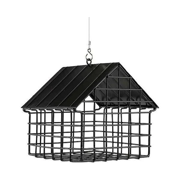 De houder is volledig uit metaal en is voorzien van een zwarte coating. De ene zijde van het dak klapt open om de vetbollen makkelijk te kunnen aanvullen. Met de bijgeleverde metalen ophangdraad kan je het voederhuisje in een boom hangen of aan een voederhaak.